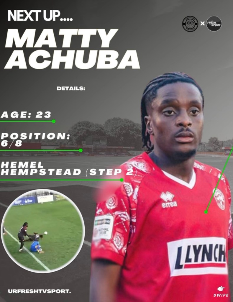 Achuba started his career coming through the youth ranks at Ebbsfleet United, however the then teenager would only make a handful of National League appearances before permanently heading to Meridian FC (Step 6) for the 2020/21 season. An impressive first season of regular men’s football at Step 6 saw Isthmian Premier side Wingate and Finchley pick him up for the start of the 2021/2022 season. During his time in North London Achuba transitioned into more of a holding midfielder and became a consistent performer in an electrifying Wingate side. But it was the 2023/24 season where Achuba really exploded, finishing with 8 goal contributions in 40 games as Wingate finished third. This form attracted the interest Bobby Wilkinson and Hemel Hempstead in 2024 and Achuba has continued to be a regular face and starter under Wilkinson’s beneficiary Lee Allison over the last year – playing a key part in the Hemel squad this season who have been challenging the play off places at Step 2 and also making it to the first-round proper in the FA Cup.