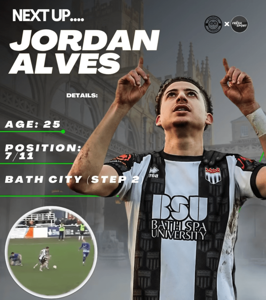 Alves started his youth career at Reading, before heading over to America to sign for Muskegon Risers. After returning from “The States” in 2019, the Hampshire born winger joined Hartley Wintney before joining Basingstoke Town in Step 4 for the 2019/20 season. Alves would then go to have a number of spells at Thatcham Town, North Leigh and Kingfishers. It wasn’t until a move to Westfield (Step 4) in November 2023 where Alves really caught fire, finishing the season with 15 goals in 37 appearances. This form caught the attention of various Step 2 clubs with Bath securing his signature for the 2024/25 season, however even with a two league jump Alves wasn’t fazed, finishing with 8 goals and 7 assists in 17 starts being the catalyst in “the Romans” bid for survival in the National League South.